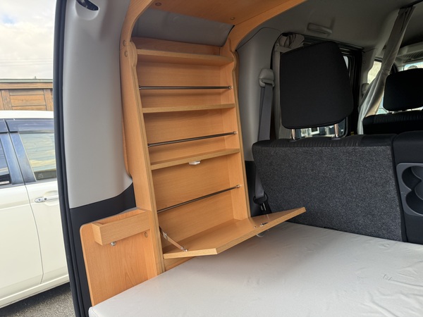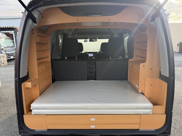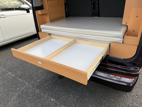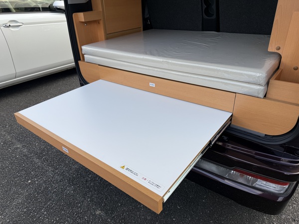 スライドテーブルや収納、カーテンなどのキャンパーとしての装備に